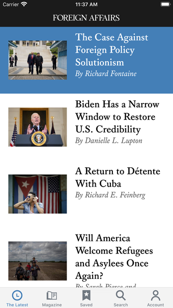 Appen för Utrikespolitik är optimerad för iPad och andra surfplattor, men den finns också tillgänglig på iPhone, iPad och andra iOS-enheter. Denna mobila version gör att du kan bläddra och läsa Utrikespolitik på din mobila enhet, samt läsa vårt aktuella nummer och få tillgång till vårt digitala innehållsbibliotek.